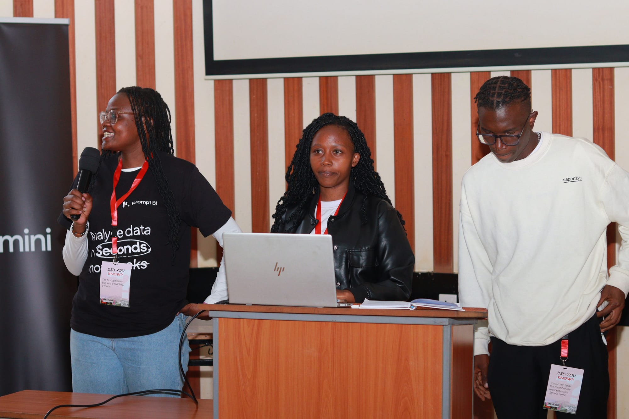 Savio Wambugu - CEO Mhub (left), Eleanora Matalanga - Organizer Devfest '25 (center), Prompt BI team (right)